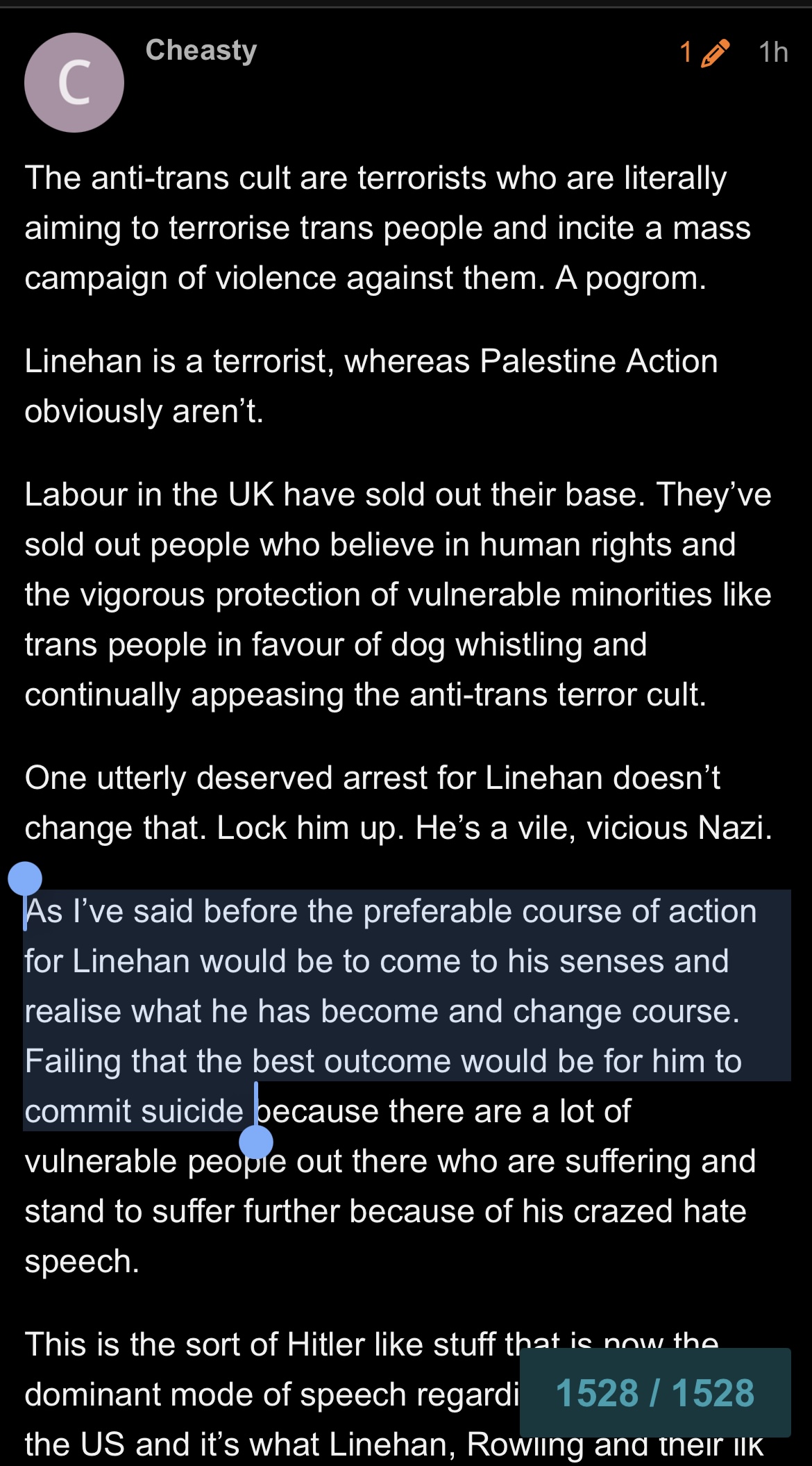 Iâd much rather he changed course than commit suicide but barring a change of course and barring him being locked up for incitement to hatred like he should be itâs the best outcome because the victims of hate speech are far more important than those who breathe it from their Hitler pulpits. Iâd far rather a hateful bastard kills himself rather than one trans person who is harmed by his hate speech. Anybody should.