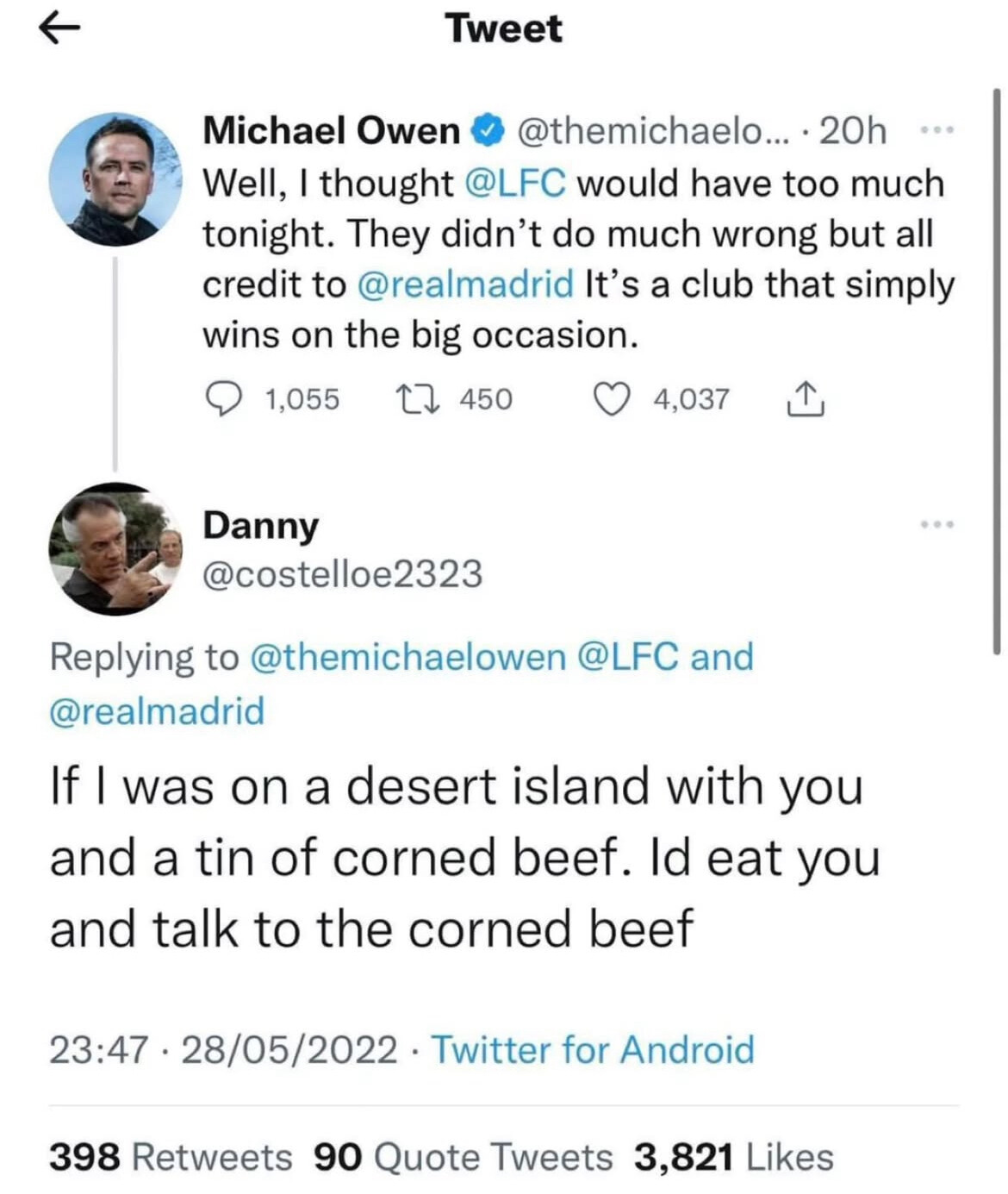 Evan would eat the corned beef and Michael Owen.
