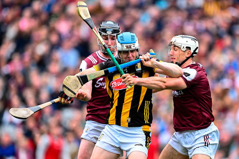 Kilkenny’s TJ Reid is tackled by Galway’s Pádraic Mannion and Daithí Burke. Photo: Ray McManus/Sportsfile