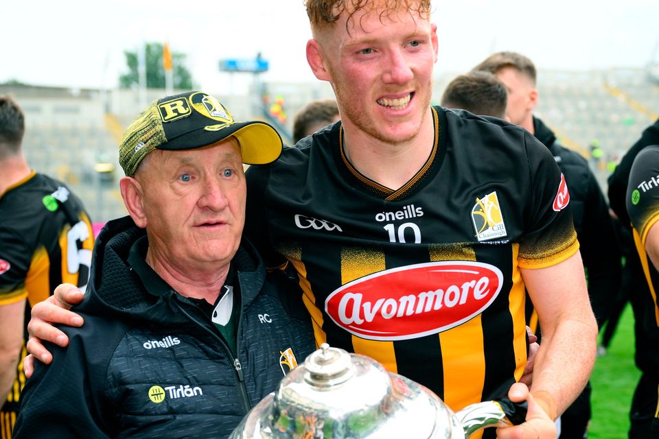 Kilkenny kit man ‘Rackard’ Cody, holding the Bob O’Keeffe Cup, celebrates with Kilkenny captain John Donnelly. Photo: Ray McManus/Sportsfile