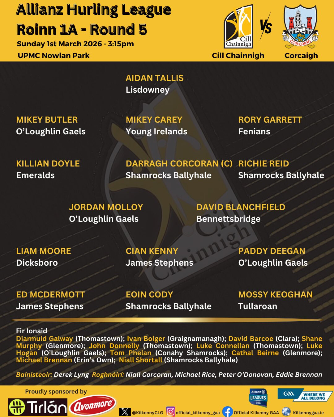 Fair inexperienced bench for KK if you discount Donnelly. Good to see Tom Phelan back