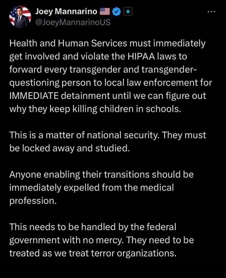 This is the sort of Hitler like stuff that is now the dominant mode of speech regarding trans people in the US and itās what Linehan, Rowling and their ilk want to happen in the UK. There is no bottom to this, it ends at extermination if not stood up against.
