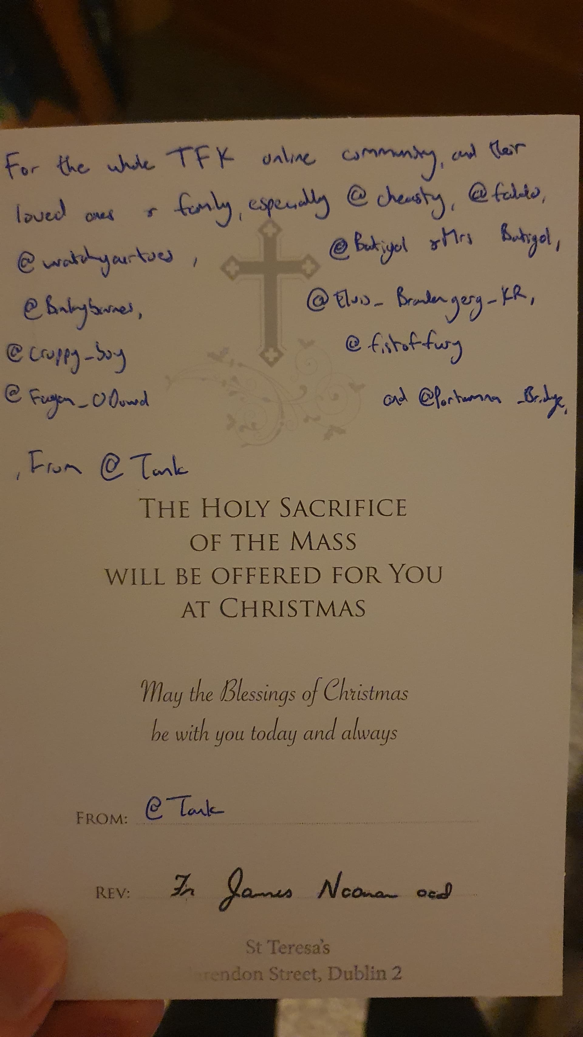 I got you all a present - mass. Masses will be said for the whole TFK community and their families by Father Noonan in St Teresa’s Carmelite Church in Clarendon Street, Dublin this month. Special regard will be had to the families of those who have suffered throughout the year, such as @Cheasty , @Faldo , @Watchyourtoes , @Batigol and Mrs Batigol, @binkybarnes , @Elvis_Brandenberg_Kr , @croppy_boy , @fistoffury , @Fagan_ODowd and @Portumna_Bridge and anyone else who has had a tough year or is going through something now.
