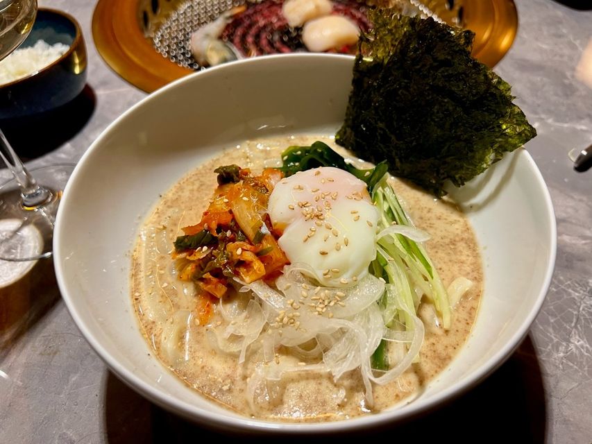From the sides and sauces, we had a kimchi plate (€8), plain rice (€5) and, for wrapping your meat morsels, a few slightly exhausted lettuce leaves at €4! Garlic butter rice (€21) incorporating pulled wagyu meat was delicious, while cold udon noodles (€19) with a soft egg, was also good, but arrived late to the party with apologies. Two dipping sauces, were poured with ceremony, but if you want more, it’s €2 a pop. Fresh Japanese wasabi (€5) was “not available today” – at a Japanese restaurant!?