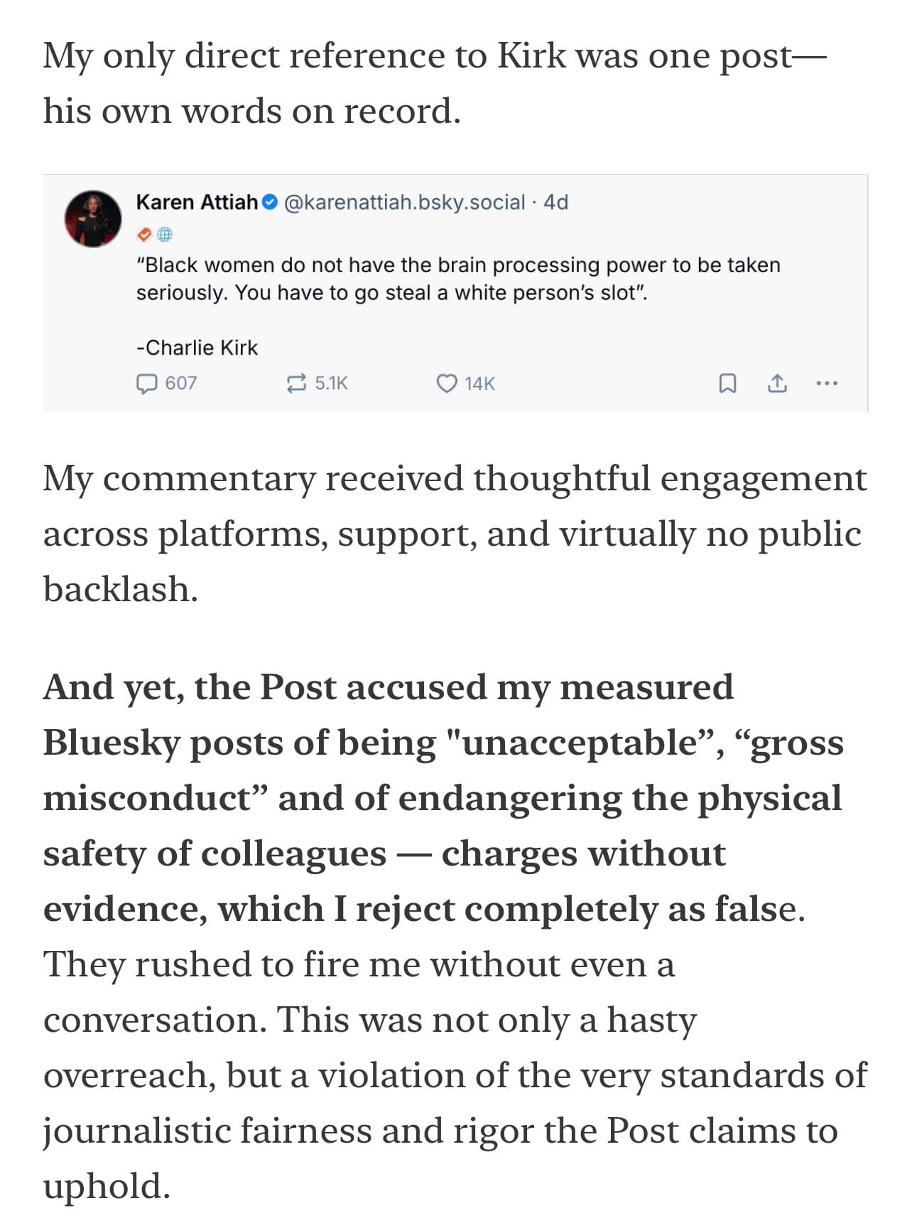 The Washington Post has sacked its only black opinion columnist Karen Attiah merely for quoting Charlie Kirk’s words.